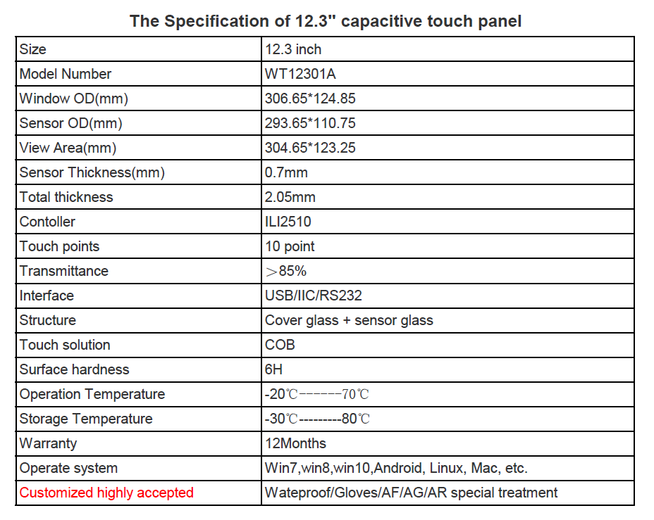 12.3寸无丝印透明盖板触摸屏